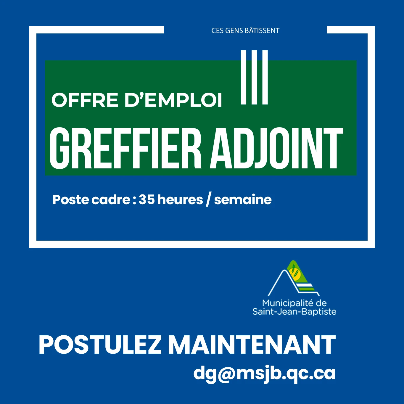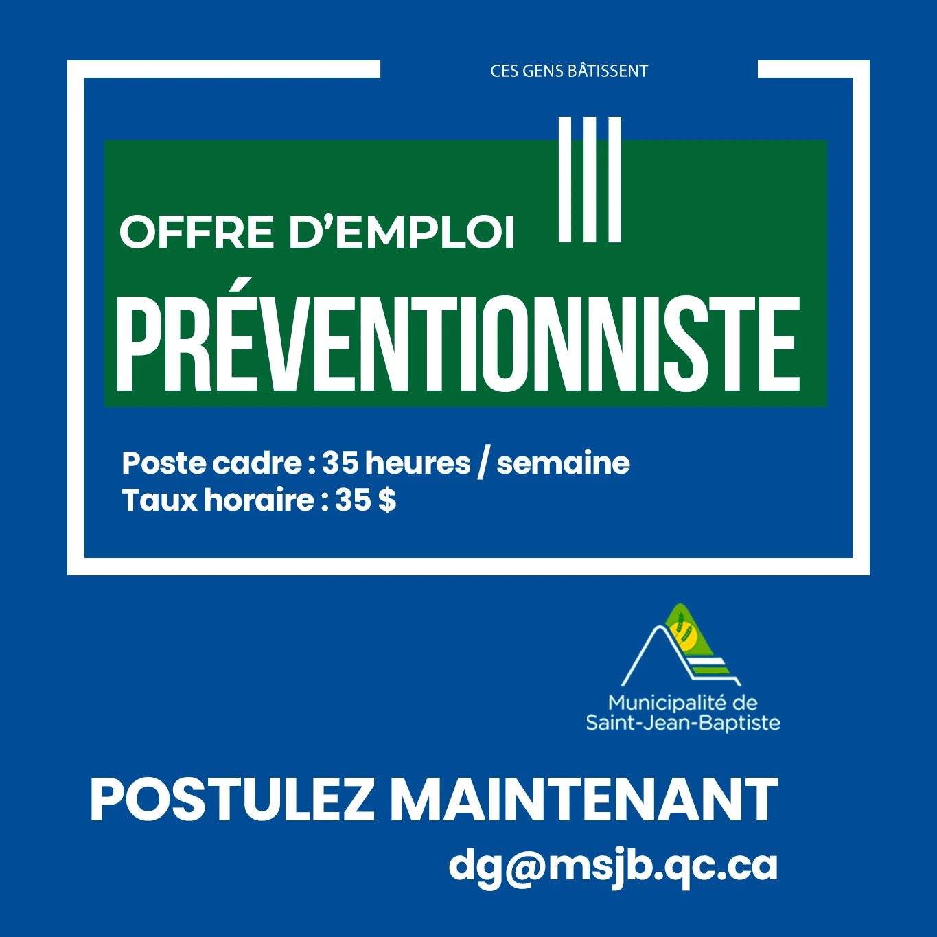 La Municipalité de Saint-Jean-Baptiste souscrit aux principes d’équité en emploi.
